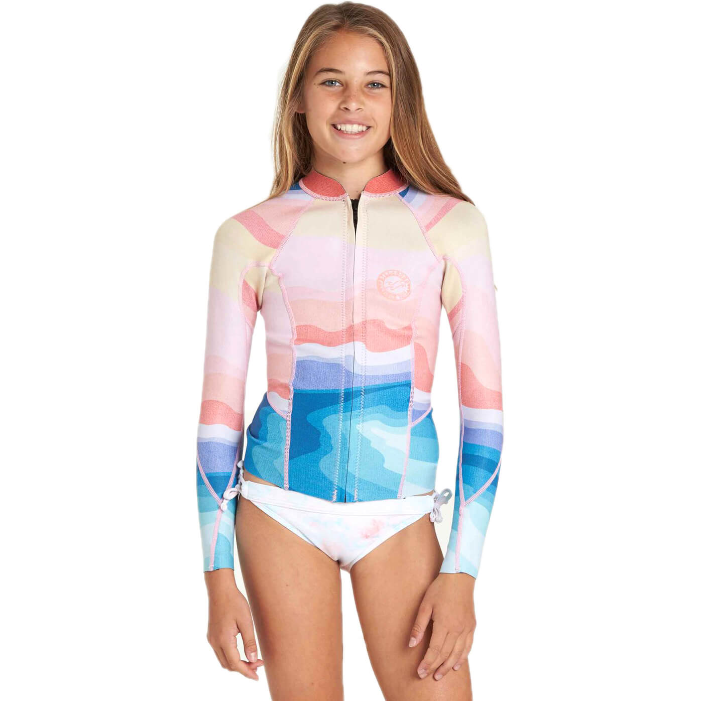 Perfect for the teens! This 1mm Junior's Billabong PEEKY Front Zip Jacket is not only stylish, but also functional. Featuring 100% stretch neoprene for the ultimate in comfort, this top is great for warm water temps! The full front exposed zipper has a nice pop of color to it and allows for seriously easy entry and exit. And for added comfort, this jacket has raw edges in the waist and in the wrists. Flatlock seams provide durability to ensure this jacket holds up wear after wear!