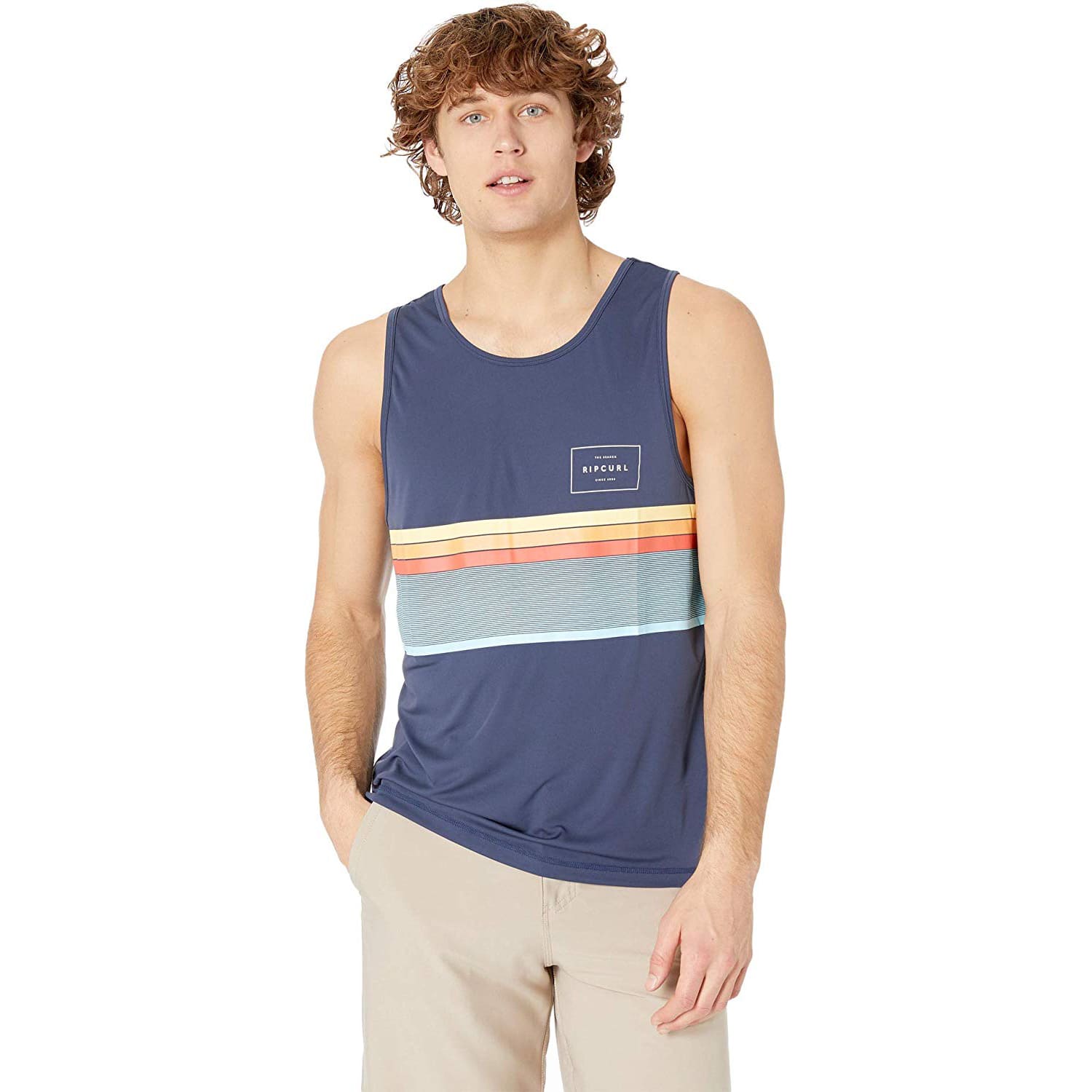 From water to boardwalk, this Men's Rip Curl RAPTURE SURFLITE Rashguard Tank is not only super cool and functional, it's also chlorine friendly (yay)! Crafted with a soft and comfortable surflite material, this tank protects you from harmful UV rays with its UPF protection rating of 50+. The t-shirt fit of this tank is also super comfortable and casual.